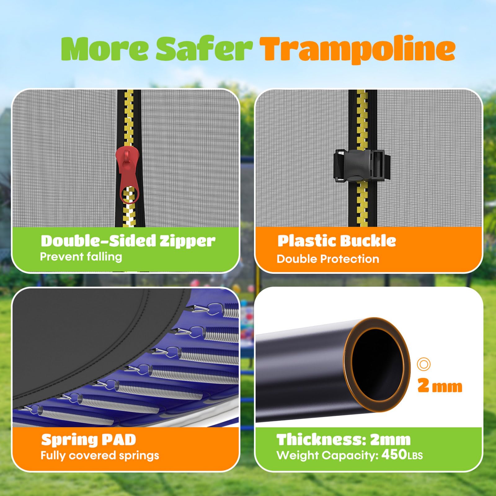 - 【Safer Structure】The 2023 upgraded ORCC trampoline features curved and thickened foam-wrapped safety poles, which increase the distance between jumpers and safety poles to prevent injuries caused by collision. Additionally, trampolines with curved safety poles provide better stability to the structure and it is not easy to roll over during the jumping process. Moreover, the reinforced safety net provides better support and can firmly hold the jumper.